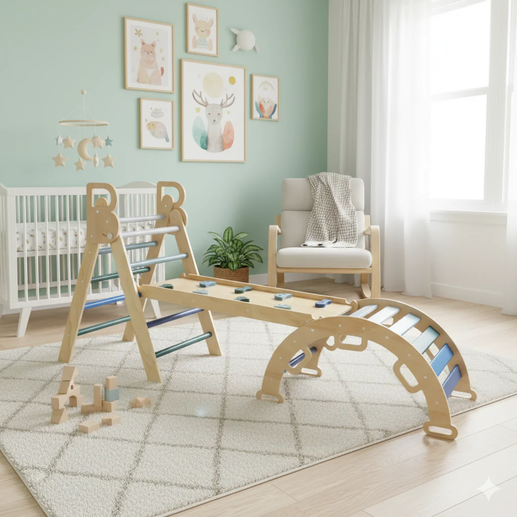 A Montessori Pikler Triangle set is a set of sturdy, wooden climbing structures designed for toddlers and young children to develop gross motor skills, balance, and confidence through self-directed, imaginative play. Created by Hungarian pediatrician Emmi Pikler and popularized within the Montessori method, these sets allow children to learn at their own pace, providing a safe and stable environment for climbing, pulling, and exploring, which fosters independence and body awareness.